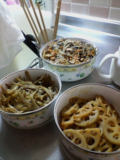 昼はごぼう、レンコン、切昆布、こんにゃく、大豆、ひじきなど